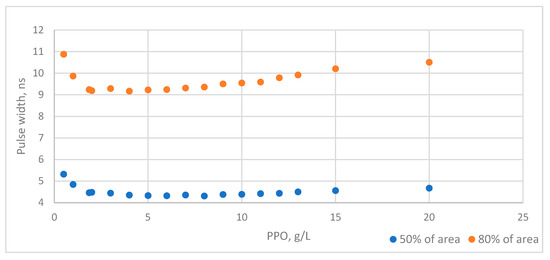 Additionally, the measurements of the PMT pulse width change with the PPO concentration were conducted. The pulse width is defined here as the time evaluated at 50% (half of the width) and 80% (full width) of the total area under the pulse, since a median is a statistically solid measure that is also applicable if the pulse shape is distorted by the long transmission line [2,8]. The results for R580 PMT only are shown because it has the smallest signal spread during the electron transit and thus is most sensitive to the pulse width change. The measurement results are shown in Figure 5. Error bars are ~0.1 ns and are not clearly visible on the plot. The high values of pulse width at very low PPO concentrations most likely are due to low signal.
