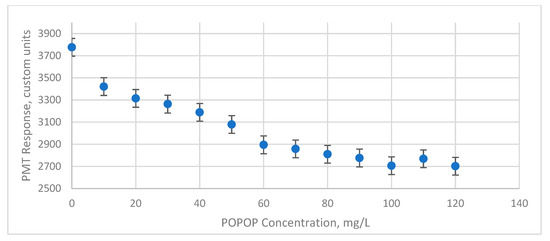 The overall trend is the overall shift of the light that is emitted by the PPO in the 350–390 nm range to the 400–460 nm range by the POPOP shifter. In the absence of the excitation light, the total integral under the curse (i.e., the total number of photons emitted) should reduce as POPOP doesn’t have perfect efficiency. Thus, the UV sensitive PMT will see an overall light reduction as observed in Figure 6. The blue sensitive PMT would first benefit from this wavelength shift, as evident from Figure 7, but eventually the total light loss will be evident as well. Therefore, the explanation for the different in detection behavior of R580 and FEU-115 PMTs is well supported by Figure 8.