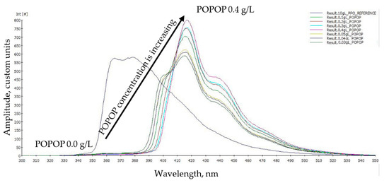 This change in the output spectrum of the scintillator vs. the POPOP concentration is presented in Figure 8. Starting with the reference spectrum of pure PPO at 10 g/L concentration, POPOP is added, and spectra are recorded. For lower concentrations of 0.03 g/L to 0.05 g/L, the change in the shape is visible. After certain value of about 0.1 g/L and above, the overall change in the output spectrum is not significant as all light from the PPO is already converted and only the total amplitude is increasing due to the higher absorption of the 200 nm light that is used for the excitation. Note that the 200 nm wavelength was chosen from the absorption properties of both the PPO and POPOP that were measured using the Cary 5000 UV-Vis-NIR Spectrophotometer.