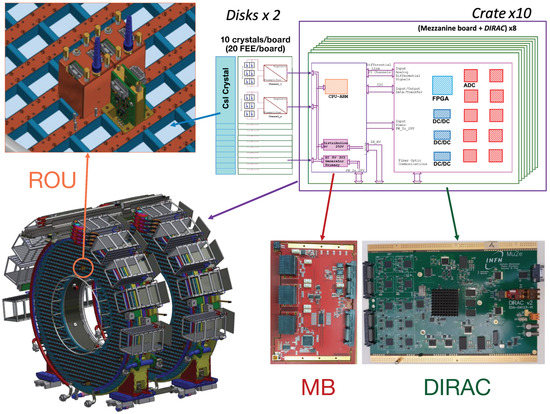 Overview of the Mu2e calorimeter readout system. Top-left: detail of the readout units (ROU) assembly in the calorimeter disk (heat exchangers are also visible). The electronics crates’ architecture, including mezzanine (MB) and DiRAC boards, is also shown on the right.