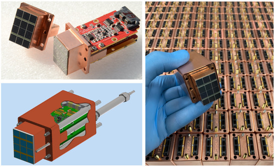 Each ROU houses two fully independent readout channels per crystal, each comprising two custom large-area UV-extended SiPMs and the relative front-end electronics (FEE) boards. The SiPMs are glued on copper holders (Figure 2, left) which are thermally coupled to the cooling system (Figure 1, top-left) for their thermalisation down to −10 °C, to cope with the nonionising-dose-induced dark current increase.