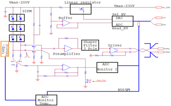 A custom high-stability, low-ripple high-voltage linear regulator provides individual bias voltages up to 200 V—programmable in 50 mV increments via the on-board SPI DAC—with a nominal current capability of 2 mA per SiPM. Integrated bias, current and temperature monitors are also present, with dedicated 12-bit SPI ADC channels.