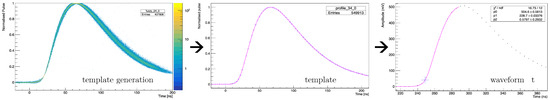 Timing and charge reconstruction, along with pile-up disentangling, are carried out on sampled pulses by means of a template fit algorithm, using a 3-parameter optimisation. To compensate any channel-to-channel signal variation, individual waveform templates—sets of interpolated nodes with fixed proportion—are generated for each channel by aligning and averaging a large dataset of sampled hits (Figure 4). Templates can then be fitted using a three-parameter optimisation (wave baseline, wave timing offset and scale). The timing fit parameter is used as a timing reference for the characterisation studies hereby reported.