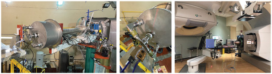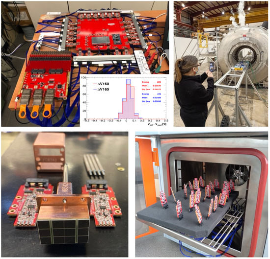 With respect to the MB processor, a preliminary simulation was carried out on-bench by fault-injection, accessing the processor memory via JTAG and performing random single or multiple bit flips while running the usual slow control functions, while first SEE data were taken during the aforementioned runs at ENEA-FNG (Figure 9, left) to validate the mitigation techniques effectiveness: the occurrence of approximately one SEU-related functional interrupt every n/cm delivered on the MB processor was observed, and it was verified that the board could correctly detect and recover operations via reset or power cycling. Similar tests were carried out for the FEE and DiRAC boards. The final validation tests for SEE on the FEE–MB–DiRAC chain are being carried out, at the moment of writing, using a 200 MeV proton beam at the Northwestern Medicine Warrenville Proton Center, US (Figure 9, right). These data will provide the correct estimation of the expected mean time between functional interrupts for each board, along with the validation of the SEL protection and other countermeasures.