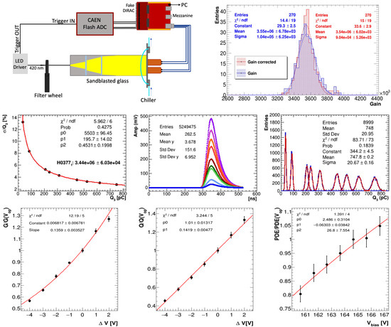 Top-left: test station architecture, including light pulse generator and attenuator. Top-right: distribution of ROU gains for a production batch. Centre: example of SiPM waveforms (middle) and charges (right) for various LED source amplitudes. Centre-left: fit. Bottom: gain, charge and PDE scans at various overvoltages.