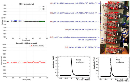 All total ionising dose (TID) qualification steps for the FEE and MB were carried out at ENEA-Calliope, a pool-type, high-intensity Co source. After a 2-year-long campaign, the final choice of FEE rad-hard SPI ADCs and DACs (ADC1280S022CIMT and 121S101CIMKX, both from Texas Instruments) was confirmed with a final test in 2020, in which a total of six FEE boards from controlled production lots were irradiated up to 105 krad (0.85 krad/h dose-rate) in different operating configurations (Figure 8). All slow control monitoring channels exhibited excellent stability throughout the test with a maximum absolute drift of 2 LSB, comparable with the case of nonirradiated boards. The stability of the regulated high voltage was better than 0.1 % at a nominal 160 V. Similar tests with ionising dose on the MB were also performed to validate the hardness of the microprocessor and the SPI communication, along with the stability and efficiency of the onboard buck converters. No detrimental effects were observed for the 25 krad TID MB requirement.