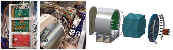For the VST, an electronics crate with a DiRAC and an MB board—and the respective cooling systems—were installed inside the Module-0 vacuum vessel to read out a total of 20 FEE channels (Figure 10, left). The 17 innermost crystals were instrumented with production ROUs, and a dual readout was used for the central and the central uppermost/lowermost crystals.