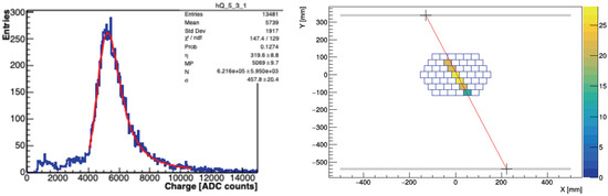 Example of MIP deposits in a crystal during VST with superimposed Landau–Gauss convolution fit (left). Example of MIP track reconstructed in the crystal matrix plane (right); colour scale represents energy deposit in MeV.