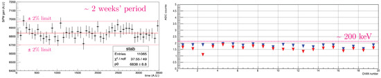 The SiPM gain was evaluated as from the fit , also shown in Figure 7. The SiPM response was calibrated—and stored in a dedicated ROU database—for different overvoltages and operating temperatures. An overall gain spread <3% RMS was observed in production. A reproducibility better than 1.5% was observed during the station operation.
