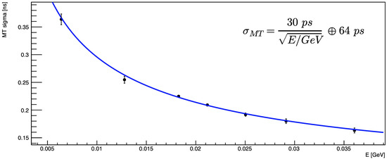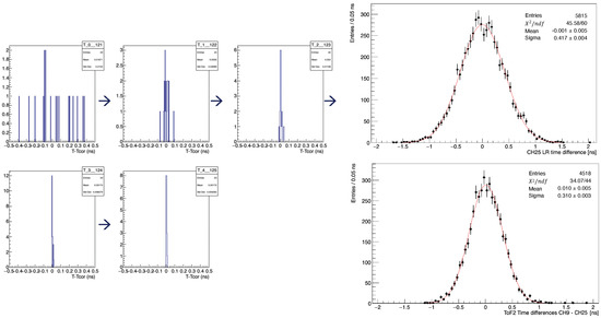 The MIP tracks inside the calorimeter were reconstructed with a 2D fit in the plane orthogonal to the crystal axes (Figure 11, right) and an iterative algorithm was used to calculate an energy-weighted time centroid for each event and adjust the relative timing offset between channels, accounting for the relative 2D time-of-flight (ToF) corrections, resulting in a relative alignment better than 5 ps RMS after five iterations (Figure 13, left). A mean time resolution of order 210 ps was evaluated with MIPs for individual crystals, from the time difference between the left and right channels of the corresponding ROU, as shown for the central crystal in Figure 13, top-left.
