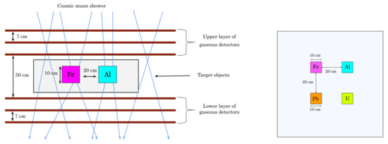 The concerned MST setup consists of six layers of position-sensitive gaseous ionization detectors that have been stacked parallelly, three each on either sides of the Region of Interest (RoI) subject to imaging with dimensions 80 cm × 80 cm × 40 cm. Four cubes of Al, Fe, Pb, and U with dimensions 10 cm × 10 cm × 10 cm have been placed in the central plane of the RoI. The gaseous detectors used in the setup have dimensions 140 cm × 140 cm × 0.2 cm. Detectors with larger active areas have been chosen to maintain uniform muon hits across the lateral span of the RoI. The design parameters of the MST setup have followed from a preceding uniformity study that was carried out in [24]. The detectors have been assumed to have a 100% detection efficiency and a spatial resolution of 200 µm, which has been added as a Gaussian uncertainty to the muon hits obtained from the simulation. Figure 1 shows the schematic representation of the model setup that has been subject to a muon flux to simulate the multiple Coulomb scattering of muons in the RoI. The Cosmic-Ray Shower Library (CRY) [29] has been used to produce muon flux for the latitude (22.57°) and altitude (sea-level) of the experimental laboratory. The FTFP_BERT physics list has been implemented to account for all the electromagnetic processes, weak interactions of charged particles and gamma radiations.