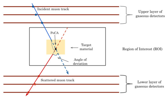 Cosmic muons are high-energy (mean ≈ 4 GeV/c) particles with a relatively long lifetime (2.2 µs) and ±e charge. They are produced naturally in the atmosphere and have a flux rate of about 1 per cm2/min at the sea level. Due to their greater mass (105.66 MeV/c2) [26], they can penetrate through large amount of materials without suffering any significant loss of energy. In addition to inelastic collisions with atomic electrons, muons passing through matter also suffer repeated elastic coulomb scattering from atomic nuclei. These collisions are individually governed by Rutherford’s formula. The vast majority of these collisions result in a small angular deflection of the particle. The cumulative effect of these small angle scatterings compounds to a net deflection of the muon from its original trajectory. According to Moliere theory [27], the scattering angles projected on a plane obey the Gaussian distribution [22,28] and the standard deviation of the distribution is given by: