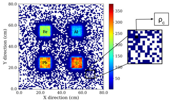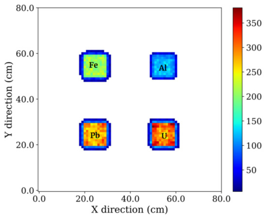 The reduction in background noise from the image plays an important role in identifying the positions of different blocks. Apart from track selection criteria, background noise has been further minimized using PRM [24]. It is a filtering algorithm wherein a specific pattern of a reference image is used to design a filter “K” called kernel. This K is then used to scan the test image to look for similar properties. It performs like a high-pass filter that allows the range of values lying above a certain threshold due to prior training. We have used PRM to eliminate the noisy events in the 2D S-map shown in Figure 3. The c obtained for the Al block has been used as the threshold to train the kernel. Since it increases with Z of the material, c for Al has been kept as the lowest threshold to minimise the noise in the 2D image. Figure 4 illustrates the result of applying the PRM to the image obtained in Section 4.2.