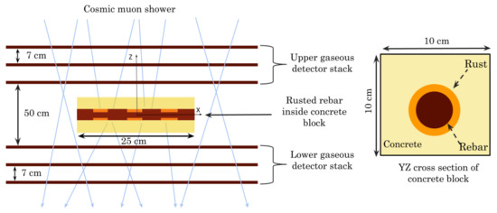 - Dobrowolska, M.; Velthuis, J.; Kopp, A.; Perry, M.; Pearson, P. Towards an application of muon scattering tomography as a technique for detecting rebars in concrete. Smart Mater. Struct. 2020, 29, 055015. [Google Scholar] [CrossRef]