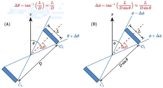 Figure 2 indicates the and angle coverage of the trigger detectors ( and ) when the telescope is oriented at a zenith angle . The length of the detectors is m and the distance between the two farthest detectors is m. Therefore, the detector has an angular resolution of about 3.0°. On the other hand, the maximum covered is and the maximum is . Thus, the solid angle, , coverage can be calculated as: