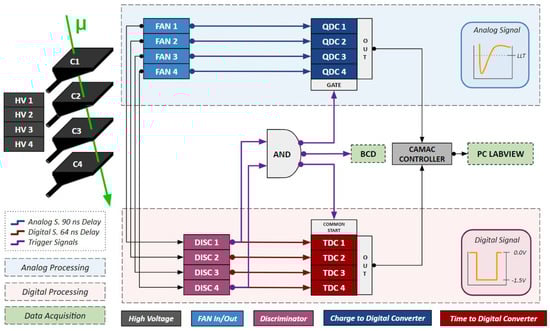 Electronic diagram for the UNIANDES muon telescope. The diagram shows the processing of analog and digital signals and summarizes the signal processing phase.