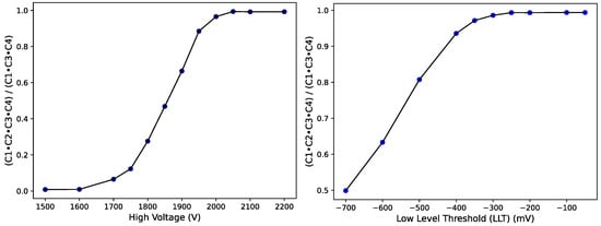 Once we found the operating HV, we also performed a scan on the discriminator thresholds for each detector. We changed the discriminator thresholds in steps of −50 mV and plotted the number of four-fold coincidences, normalized by the coincidences of the other three detectors, as a function of the discriminator threshold for detector . We set the LLT value 100 mV higher than the value at which the curve started to drop down (see Right panel of Figure 5 for the case of detector ). The optimal LLT found was −200 mV, the same value was set up for all four detectors. The optimal operating HV was 2100 V for detectors , and , while the HV for detector was 2300 V.