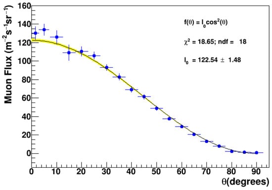 - Pethuraj, S.; Datar, V.; Majumder, G.; Mondal, N.; Ravindran, K.; Satyanarayana, B. Measurement of cosmic muon angular distribution and vertical integrated flux by 2 m × 2 m RPC stack at IICHEP-Madurai. J. Cosmol. Astropart. Phys. 2017, 2017, 021. [Google Scholar] [CrossRef][Green Version]