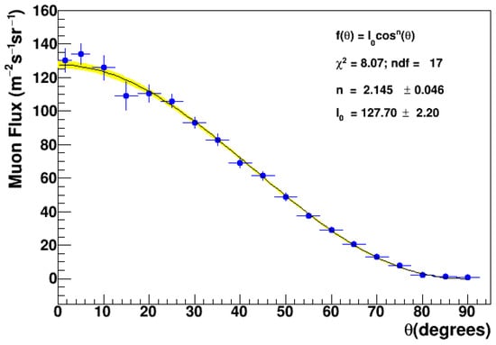 We fit a cosine squared function () to the measured flux distribution as shown in Figure 6. The per degree of freedom is 1.04, indicating that the measured distribution is statistically compatible with a dependence with the zenith angle. We also perform a fit allowing the exponent of the distribution to vary freely (), as indicated in Figure 7. For this second case, we obtain a lower per degree of freedom (), for an exponent slightly higher than 2 (). By using the covariance matrix of the fits we also determine the one sigma uncertainty of each fit function as indicated by a yellow band in the figures.