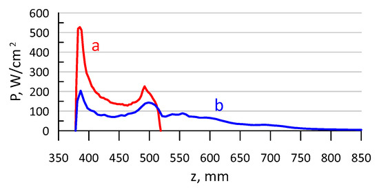 Based on such a selection of model parameters, qualitative results were obtained on the change in power density due to the consideration of the secondary emission of electrons from the collector surface of the technological gyrotron with an electron beam current I = 2.4 A and an accelerating voltage U = 23 kV. When secondary electrons are considered, the trace of the electron beam lengthens several times. This requires a significant lengthening of both the entire collector and its cooling zone. At the same time, the peak thermal load on the collector is significantly reduced, which opens up the possibility of using smaller diameter collectors in gyro devices. The calculated power density profile on the collector is shown in Figure 1. The beam trace length was about 5 cm without secondary emission and increased to about 15 cm when secondary particles were considered.