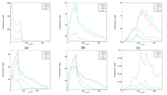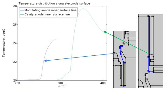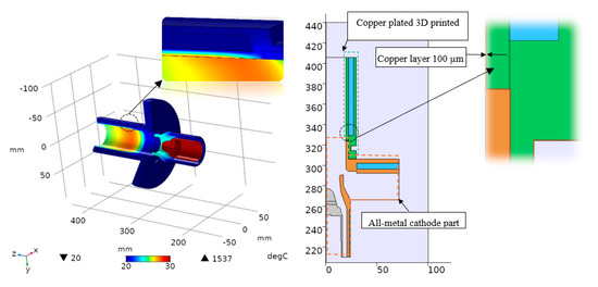 According to the simulations, the main thermal heating was due to the thermal radiation of the cathode itself, the temperature of which was about 1500 °C. Obviously, the copper-clad photopolymer part was the most vulnerable from the point of heating due to the poor thermal conductivity of the plastic, which was observed during the modeling process. In Figure 3 a graph of the temperature on the surface of the most heated areas is shown. The maximum temperature did not exceed 28 °C, which was achieved due to the embedded cooling system.