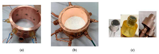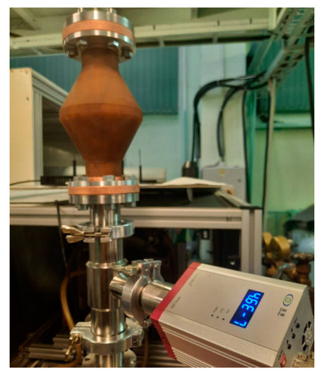 In its absence, the maximum temperature of the parts was significantly higher. Despite the low thermal load in the printed part, the thickness of the photopolymer in the region of maximum temperature was minimized due to the low thermal conductivity of the photopolymer. The thickness of the copper coating was chosen based on the results of an experiment to study the vacuum resistance of a copper-plated printed model (see Figure 4) with a large (about 1 L) internal volume. In the course of this experiment, a HiCube 80 pumping station with a capacity of 67 L/s was used and the test model was connected to the vacuum system in the configuration proposed for connecting the cathode part to the HEB transport element. The reached limit of the vacuum level of the pump itself (10−7 Torr) in the test model with a copper coating thickness of about 200 μm demonstrated the successful testing of both the connection itself and the copper plating technology. Note that in this case, after chemical metallization, a denser layer of copper was galvanically grown.