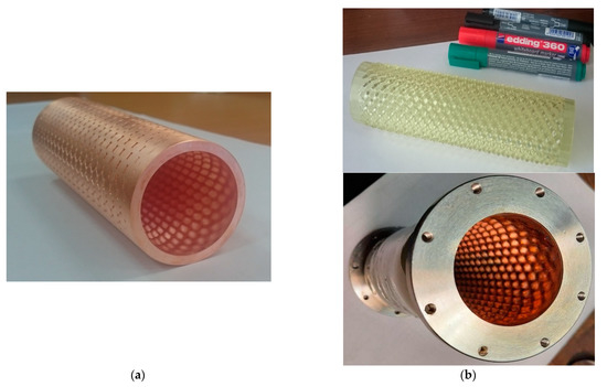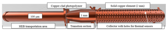 The manufacturing technology of the collector with sensors was as follows: after the mandrel (created on Phrozen brand printers with an 8 K resolution matrix) was metallized, the thickness of the copper layer was increased to 1 mm and polymer “skeleton” was deleted. Then, sensors in photopolymer sleeves with a metallized end on the inside of the collector were installed into the holes for temperature sensors, with the help of which the trace of the electron flow was studied. Then, to create a whole dense layer on the inside of the collector, another 1 mm of copper was added.