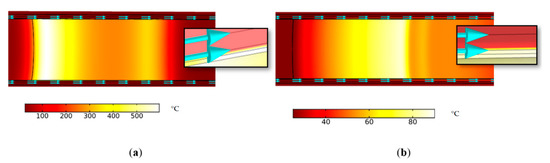 The technological 28 GHz gyrotron driven by 2.4 A/23 kV electron beam was taken as the basis for the future complex. As a part of this task, the nodes for connecting parts of the gyrotron were developed, considering the restrictions on installation in a magnetic system and the organization of cooling channels. First, the connection point of the cathode leg and the details of the channel for transporting the electron beam to the gyrotron cavity were worked out. To avoid the effect of generation, the cavity was replaced by a structure of complex geometry, which suppressed the excitation of the RF-field in the beam transport channel. We used the COMSOL Multiphysics program [41] to calculate the temperature distribution in the proposed configuration of the connecting node to take into account thermal radiation from the cathode. We also calculated the mechanical stresses created when the polymer is joined to the metal. The simulation results are shown in Figure 2.