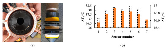 This section of the collector was experimentally tested for operability in the process of heating its inner surface with a profiled heat source, which was a nozzle on a hot air gun with a temperature control. During the experiment, two temperature profiles were set, with one and with two maximums. The temperature difference between the initial (room) and stationary temperatures was measured at each sensor during heating. Despite the negative factors, such as: (1) a small number of sensors (7 pcs.); (2) narrow, about 7 mm, axially symmetrical air duct; and (3) high thermal conductivity of copper, blurring the distribution, the resolution of the thermal sensors was sufficient to clearly observe the extremes of the heat source profile. The results are shown in Figure 10.