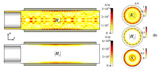 Simulations of 2D SWO based on the “Sinus-6” accelerator were carried out using PIC code CST Studio Suite. Parameters for the simulations were taken close to the experimental conditions. The results of simulations are presented in Figure 12 and demonstrate the establishment of a narrow-band oscillation regime under the design parameters. The output power reached 0.5 GW under the electron efficiency of ~25% (Figure 12a). Longitudinal and transverse structures of the various components of the RF-field inside the interaction space of the oscillator are shown in Figure 12b. Components Hφ and Ez corresponded to the interference of the axially propagating partial waves interacting with a rectilinear tubular REB, and the Hz field component corresponded to the interference of transversely (azimuthally) propagating partial wave-beams (“waves of synchronization”). Simulations demonstrated that the RF-field structure corresponded to the excitation of the fundamental mode of a 2D-periodic slow-wave structure. At the same time, the spatial distribution of the partial wave synchronous to the electron beam (emitted from the SWO) had an azimuthally symmetric structure and, when decomposed by proper waves of a cylindrical waveguide, contained the waveguide modes of the TM0,n type.