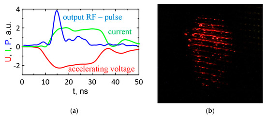 For the implementation of the Ka-band SWO at the “Sinus-6” accelerator facility, electron–optical experiments on the formation of a wide tubular REB with a diameter of about 40 mm were conducted and the stable transportation of this beam through the interaction space was achieved in the solenoid with a guide field of ~1.4 T. In the proof-of-principal experiments, powerful narrow-band radiation was detected under the design parameters. Typical oscilloscope traces of accelerating voltage and RF-pulse are presented in Figure 13a. An output radiation directional diagram was analyzed by means of the neon bulb panel set at various distances from the oscillator output window (see Figure 13b) and demonstrated a pronounced minimum at the axis, which corresponded to the excitation of designed pattern of TM0,n-type modes. The output power (according to colorimetric diagnostic) was measured at the level of ~200–250 MW.