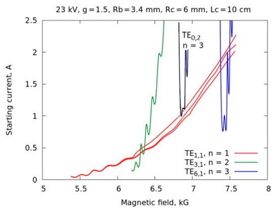 According to the simulations, if we used the traditional gyrotron cavity with the circular azimuthally symmetric cross-section, then the tubular electron beam excited the rotating mode TE1,1 at the fundamental cyclotron resonance. In a wide range of magnetic fields, it was suppressed with the wave excited at higher cyclotron harmonic (Figure 16). However, if the excitation of the mode TE1,1 was suppressed, then we could expect the excitation of other modes, in particular, the mode TE0,2 at the third cyclotron harmonic. Actually, according to Figure 16, in the magnetic field range close to 6.9 T, in this case only the mode TE0,2 was excited at operating currents 1–2 A. In the absence of the mode TE1,1, she had no other competitors. The numerical simulations below confirm this statement.