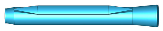 We planned to prove this using a cavity with one azimuthal irregularity (groove). The 3D model of this cavity is shown in Figure 17. The radius of the groove was chosen from the condition that the cutoff frequency of the mode TE0,3 corresponding to this radius coincided with the cutoff frequency of the mode TE0,2 of the original circular waveguide. The irregularity had the shape of a “boat”. This was completed in order to align the ends of the cavity with round conical sections and to exclude the transformation of the operating mode TE0,2 into other modes. For this, transition regions were provided in which the angular size of the groove sector decreased linearly to the ends of the cavity.