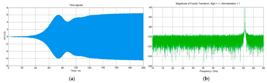 Results of the 3D CST simulations of a V-band gyrotron with a cavity and with a selective cavity with an azimuthal groove: (a) time dependence of the amplitude of the output signal demonstrating the establishment of the stationary regime of generation (the square of the amplitude corresponds to the instantaneous power in watts); (b) frequency spectrum of the field inside the cavity—only the third harmonic of the cyclotron frequency was excited.