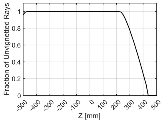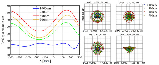 For the experimental configuration, the effective focal length in the image space is 324.219 mm, the working F number is 2.0473, and the paraxial magnification of the lens module is −0.279. The max image space NA is 0.2431. If there is no anti-reflection (AR) coating on the faces, the total transmission of the lens module and silica window is about 46%. Every surface is thus AR-coated for a wavelength of 500–1100 nm, which is expected to increase the total transmission to over 60%. The lens supplies a well-focused image, as shown in the root mean square (RMS) spot radius and spot diagram in Figure 2. For wavelengths of 700 nm, 800 nm, 900 nm, and 1000 nm, the RMS radii are all smaller than 170 . Here, the RMS spot radius gives a rough idea of the spread of the rays; the distance between each ray and the reference point is squared and averaged over all the rays. It depends on every ray and thus encloses most of the energy. The spot diagrams of the corresponding TS spatial points are also small enough both on and off the axis. As the vignetting diagram shows in Figure 3, the collection’s optic lens can also present a vignetting under 10% at 300 mm. In other words, most images of the spatial points in the FOV are clear enough and lose little energy.
