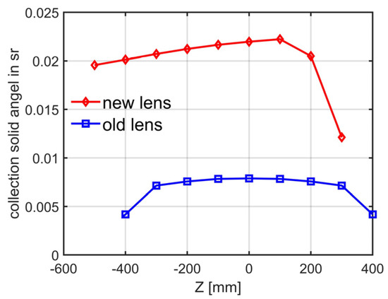 When other parts of the TS system remain the same, the increase of the input solid angle is the key to higher SNR. As a comparison, the old lens was much smaller. The maximum aperture of the old lens was only 152.036 mm. Although the image quality was a little better, the FOV and the amount of light input were much smaller. The FOV of the old one could not cover an area other than ±400 mm. Correspondingly, a comparison of the collection solid angle versus FOV can be found in Figure 4. The solid angle of the old one was too small to capture enough photons for high SNR signals. Additionally, the new lens can supply about a threefold larger collection solid angle.