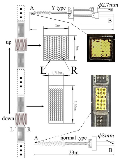 Arrangement design of the slots for fiber bundles, A\B-side design of the fiber bundles, and their pictures. Side A is defined as the input face located at the image face, and side B is the output side inserted into the polychromator. “L” is left, and “R” is right.