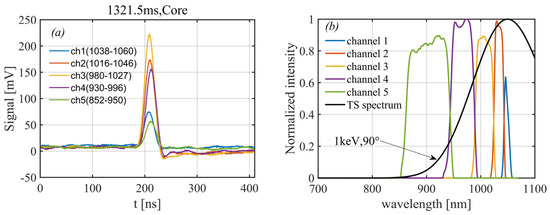 (a) The waveforms of the final signals of five channels for the core point. (b) The relative response versus wavelength of the five channels of the corresponding polychromator for the core point; and the normalized theoretical TS spectrum of 1 keV at a scatter angle of 90°.