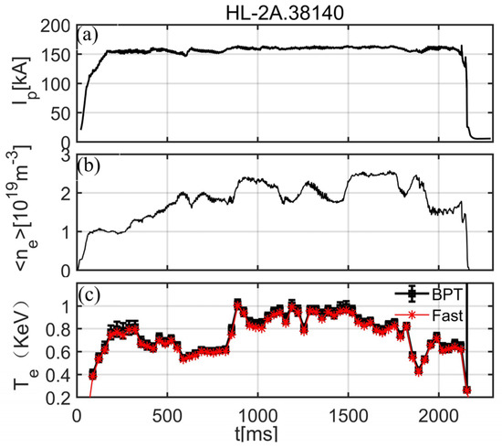 (a,b) Time trace of the plasma current and midplane line average electron density by Far Infrared Ray interference system (FIR). (c) Time evolution of the core plasma temperature obtained by two fitting programs. “BPT” is the program based on the Bayesian probability inference method in [15], and “Fast” is the code used here for the preview.