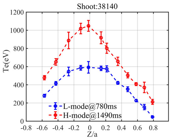 The temperature profiles measured by the upgraded HL-2A TS system at two moments of the L-mode and H-mode, respectively. Z is the height to the midplane of the measurement point, and a = 400 mm is the minor radius.