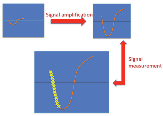 The signal originating from the fast silicon detector is amplified with very limited shaping (so without affecting the main timing characteristics of the signal such as its duration and fast rise time). This is performed using front end electronics designed and developed at the University of Kansas using standard electronic components [4] that allow us to considerably reduce the price of the amplifier. The following step consists of performing fast sampling and digitization of the signal as shown in Figure 1. This presents two advantages. First, it allows us to obtain a very precise time stamp when the signal (or, in other words, a particle) arrives in the detector (this is used to measure the time-of-flight of particles in high energy physics with a precision of 15–20 picoseconds, the duration of the signal being only a few nanoseconds). Second, it provides a reconstruction of the full signal in terms of its amplitude and shape by performing an interpolation between the sampled points (there can be up to 64 or 256 points depending on the specific sampler [3,5]). In order to check the performance of the fast silicon detectors and their read-out electronics, we installed a full test stand at the University of Kansas that uses a laser beam or radioactive sources, and in addition, we performed some beam tests at Fermilab, Batavia, USA, and the preliminary measurements showed timing resolutions between 15 and 30 picoseconds for ultra fast silicon detectors [2]. These results were obtained during beam tests at Fermilab and at CERN, where reference timing was given using a Si photomultiplier.