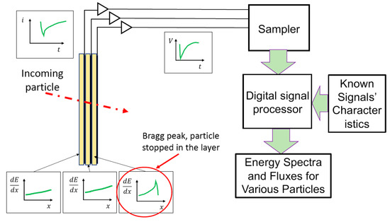 The first application using fast silicon detectors is the AGILE (Advanced enerGetic Ion eLectron tElescope) project in collaboration with NASA. Its main goal is to identify the kinds of particles emitted in cosmic rays originating from the sun or from space (electrons and ions H-Fe) and at the same time to measure their energies in the MeV–GeV range [4]. This should be performed directly in space using a compact, low-cost, and low-power detector installed onboard a small satellite (e.g., CubeSat) in order to reduce the cost of the apparatus. The basic idea is quite simple: we can use multiple layers of fast silicon detectors to measure and reconstruct the signal when the particle completely stops in a given layer of the silicon detector (the so-called Bragg peak) using the fast sampling technique. This approach is called pulse shape discrimination (PSD) and its simplified schematic is shown in Figure 2.