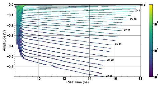 In order to identify the type of particles in cosmic rays and to measure their energy, we chose to use two estimators (we needed to select “digested” simple information on the signal in order to minimize the quantity of information to be sent back to Earth from space). The first one is the rise time (the time between 25% and 100% of the signal amplitude) and the second one is the amplitude of the signal, both measured in the layer where the particle completely stops (from the trigger point of view, we will require no signal in the next layer). These two quantities are sufficient to identify the type of the particle and to estimate its energy in most of the phase space. The amplitude as a function of rise time in the stopping layer (as put in the reference database) is shown in Figure 4 for different particles with Z between 2 and 28 [4]. The data were obtained using a detailed simulation consisting of three main stages: simulation of the energy deposition within detector medium using GEANT4 [6], detector response simulation using WEIGHTFIELD2 software [7], and simulation of the read-out electronics (LTSPICE) [8]. The different curves (corresponding to different values of Z) do not overlap for a rise time above 6 ns. The overlapping region corresponds to approximately the initial third of the stopping range in a detector layer. It means that particle identification or in other words, the Z value, can be obtained from the measurement of the rise time and the amplitude. Once the type of the particle is known, its energy can be measured using the amplitude of the signal for all kinds of ions in space for a wide range of energies with good resolution (∼5%, which agrees with the experimental data obtained using Am-source, see below).