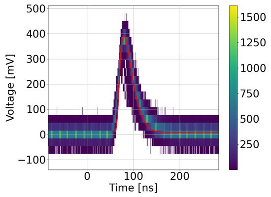 Two-dimensional density histogram of the signals recorded from an Am-source (E 5.5 ṀeV). The simulated signal is plotted as a solid red line. The inverted signal polarity with respect to Figure 4 is due to the specifics of the simulation of the read-out electronics by LTSPICE software.