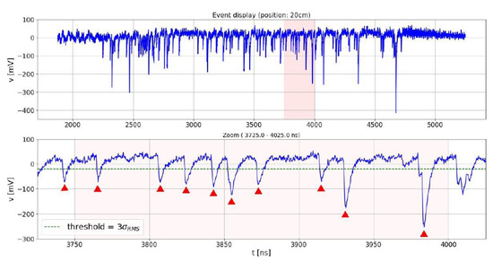 Another application where the same kind of fast silicon detectors can be used is the measurement of the dose delivered to patients when treated for cancer especially using flash beam therapy (e.g., with high intensity proton or photon beams) [9]. Our fast silicon detectors along with the read-out electronics were tested in an electron beam, which was previously used for radiotherapy at St Luke Hospital, Dublin, Ireland. Such a system provides a precise and instantaneous measurement of the dose without the need of calibration and with high spatial resolution (typically mm). The key idea here is the ability of a fast enough detector to discriminate and count every single particle (electron or proton). Figure 6 shows the results of the test at St Luke Hospital. Each spike on the plot corresponds to a signal in the detector and is considered as a particle (here an electron) crossing it. The duration of the signal is only a few nanoseconds and this fact is fundamental, especially for flash beams when the number of particles in the beam is high. In the bottom of Figure 6, we clearly see the signals above the noise that trigger our detector (red triangles) as a function of time. We notice that having both a short signal and a very fast sampling method are musts to be able to measure the instantaneous dose delivered to the patient.