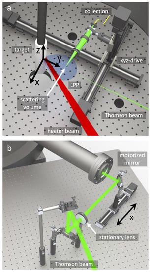 (a) Schematic layout of the experimental setup inside the vacuum chamber, showing the target and beam configuration. The LPP explodes along the -axis. The collection lens and scattering volume are automatically aligned using a motorized xyz-stage inside the vacuum chamber. (b) The Thomson probe beam can be translated along the -axis using a motorized turning mirror outside the vacuum chamber. Translating the probe beam and collection lens simultaneously allows 2D measurements in the xy-plane.