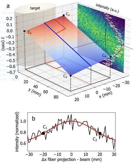 In order to construct a plane and motion profile for a raster Thomson scan, the beam height is interpolated from Rayleigh scattering measurements at the four corners, C through C. For these measurements, the beam is first translated to the required x using the final turning mirror, while the collection assembly is moved to the required position . The Rayleigh scattering intensity is then measured while scanning across the beam at 1 Hz in 0.1 mm steps and the beam center z is determined with 10 m accuracy from a Gaussian fit to the experimental data. Measuring the z-coordinates of the four corners through allows us to calculate the beam height at an arbitrary position in the plane. If the four corners have the coordinates , then the z-coordinate of the beam position at is given by the following formula: