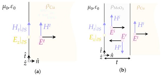 Figure 1. Simplified scheme describing the EM fields that define (a) Z s in the bulk-Cu case and (b) Z e f f in the MoO 3 -film case, at the cavity’s cross section boundary ( S ). In both cases, E z | S (plotted in yellow) represents the perturbation field ( E z in TM cases).