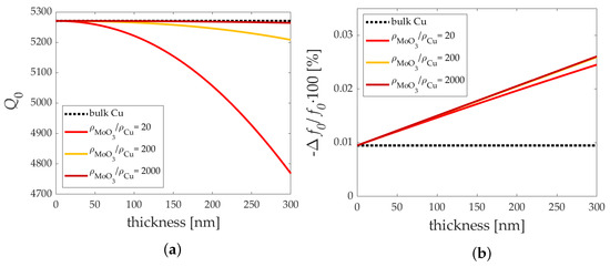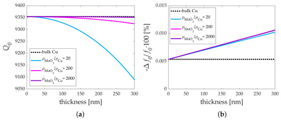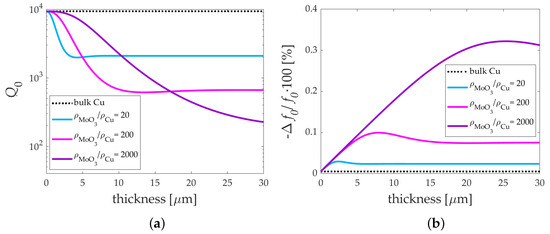 Figure 5. Pill-box parameters at f 0 11.4 GHz : (a) Q 0 and (b) Δ f / f 0 , as a function of MoO 3 film thickness in the bulk scale, and parameterized by the ratio between the coating and substrate resistivities ( ρ MoO 3 / ρ Cu ).
