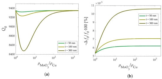Figure 4. Pill-box parameters at f 0 11.4 GHz : (a) Q 0 and (b) Δ f / f 0 , as a function of the ratio between the coating and substrate resistivities ( ρ MoO 3 / ρ Cu ), and parameterized by the MoO 3 film thickness.